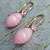 Ein schönes Pinkopal-Paar habe ich zusammen mit rosa Saphiren und warmem 18karätigen Gelbgold zu femininen Ohrhängern verarbeitet. Die Opale sind leicht transluzent und dadurch schmelzend zart. Ihre Farben reichen von Sorbetrosa zu Babyrosa und jede Pampel zeigt eine deutliche individuelle Bänderung. Die beiden Saphire sind kräftig rosa, dabei ganz leicht bläulich mit einem Hauch Lavendel. Exzellent geschliffen funkeln sie fabelhaft im Licht. Gefasst sind sie in glatten Zargenfassungen aus 750 Gelbgold. Den Golddraht, aus dem ich die Ohrbügel geformt habe, hatte ich zuvor auf die richtige Stärke gezogen - nicht zu dick und nicht zu dünn - und die Bügel lang genug gehalten, damit die Hängeohrringe sicher am Ohr sitzen.
