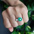 Der eingefasste Chrysopras besitzt eine schöne transluzente Qualität, die das Licht in ihn eintauchen und subtil glühen lässt. Und die eingeschliffenen Facetten auf der Oberfläche lassen geben dem Edelstein eine weitere Dimension. Das weiche Smaragdgrün ist zugleich warm und kühl.
