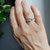 Ausgefasst habe ich den Ring mit einem ovalen Turmalin. Einem kleinen, salbeigrünen Edelstein mit einem hübschen diffusen Schimmer und zarten Einschlüssen. Das helle Grün ist leicht grau und kühl, aber nicht blau. Begleitet wird der Turmalin von zwei dunkelgelben Citrinen im Brillantschliff, die im Licht sehr fein funkeln.